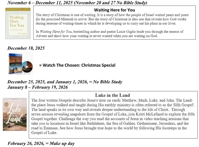 Thursdays at 10 am at the Welcome Center (various studies throughout the year)